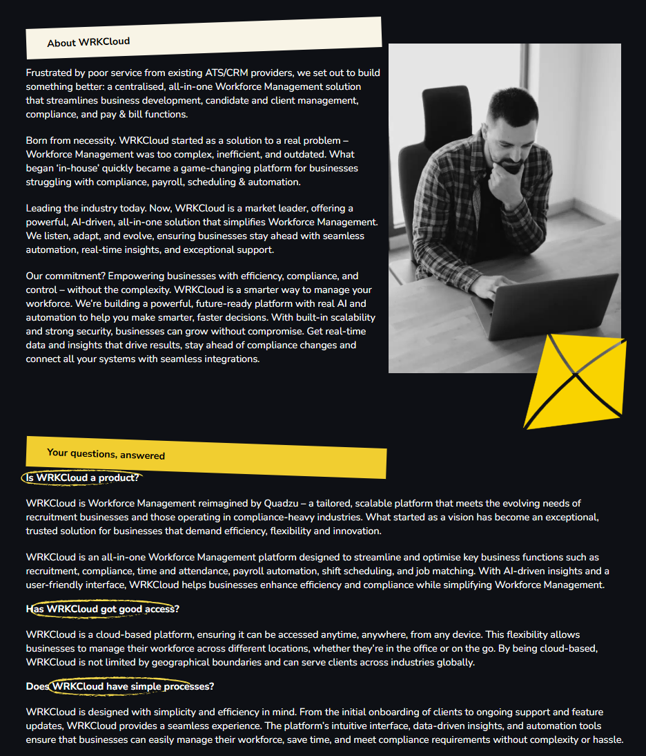 WRKCloud is an all-in one Workforce Management platform that makes business operations seamless and enhances productivity without adding complexity. Clients get first-class service, support, and exceptional value for money. We listen, adapt, and constantly improve. Want more from Workforce Management software? WRKCloud is the reliable, efficient, and user-friendly choice.